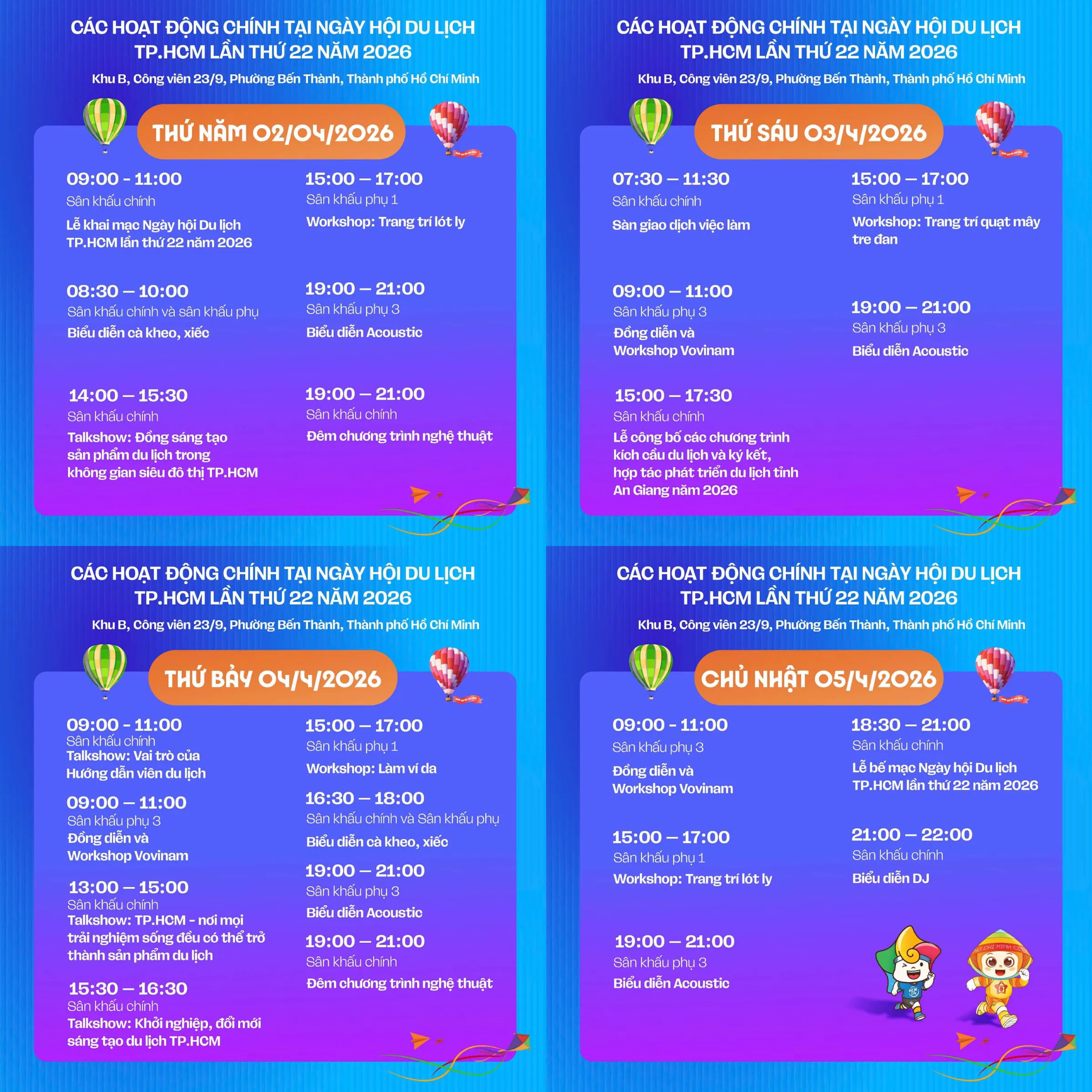 Đừng bỏ lỡ "tọa độ" hot nhất tháng 4 này! Ngày hội Du lịch TP.HCM lần thứ 22 chính thức quay trở lại với chủ đề "Rộn ràng hè về", hứa hẹn mang đến một không gian du lịch rực rỡ và sôi động. Sự kiện diễn ra từ ngày 02/04 – 05/04/2026 tại Công viên 23/9, Phường Bến Thành, Quận 1, TP.HCM.