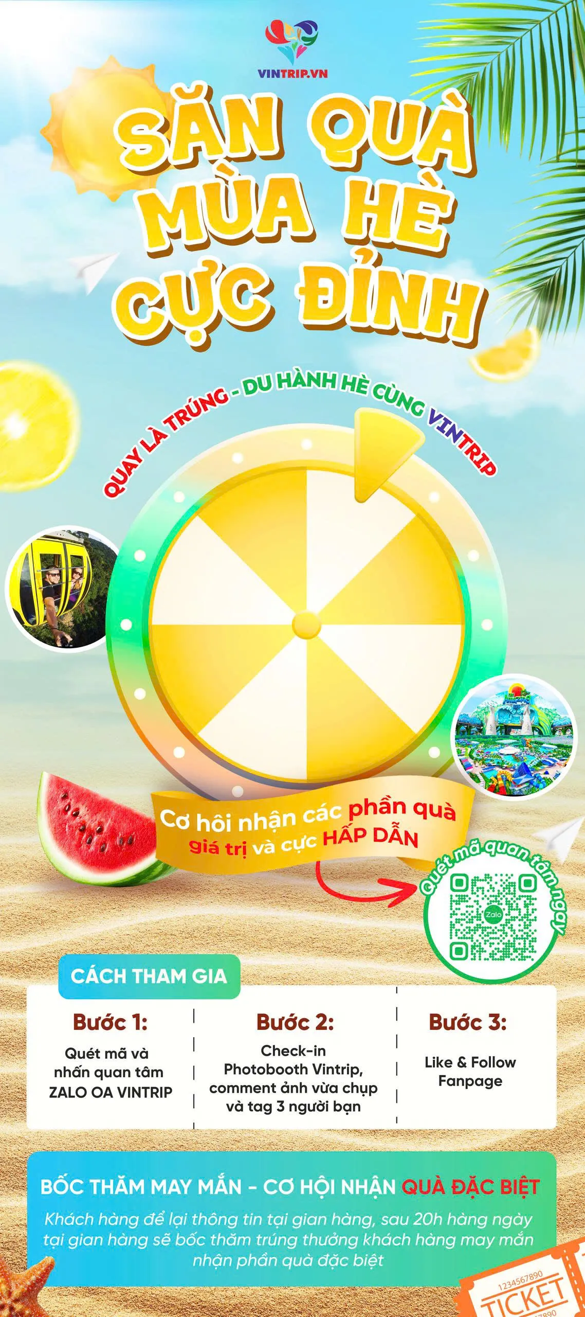Tham gia bốc thăm may mắn vào lúc 20:00 mỗi ngày (02/04 - 05/04) để sở hữu vé 0Đ tham quan tại các khu vui chơi hàng đầu.